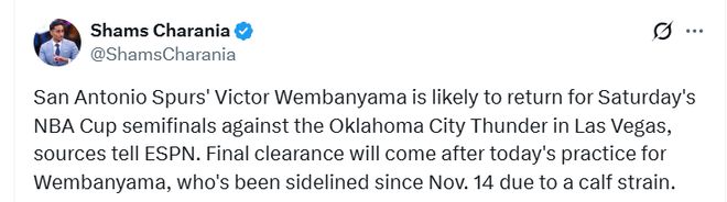 北京时间12月13日,据名记Shams报道,马刺队球星文班亚马预计将在周日对阵雷霆的NBA杯半决赛中复出。马刺已正式将文班亚马列为大概率出战球员。